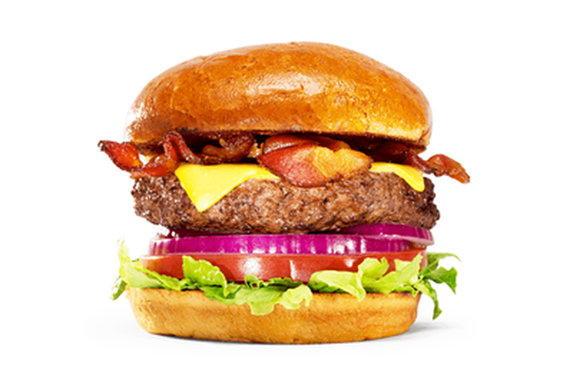 булочка бріош, яловича котлета, сир чеддер, пепероні, томати, салат, мариновані огірки, соус барбекю