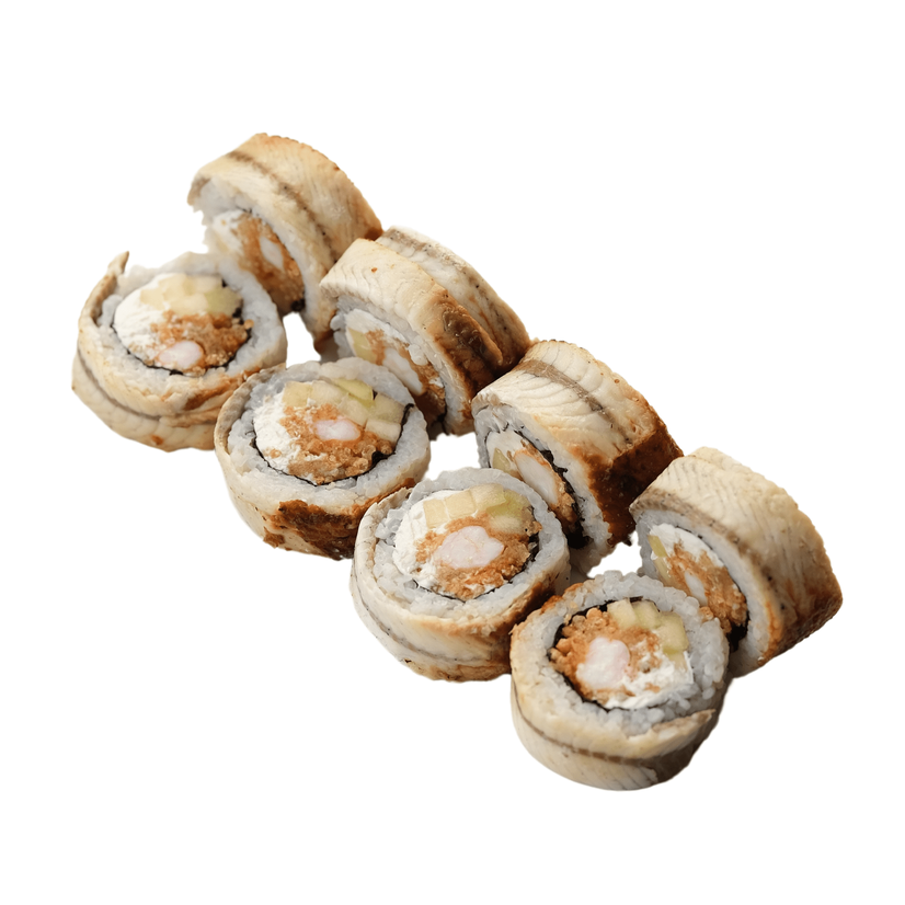 Креветки тигрові, вугор, рис, норі, крем-сир, манго, сухарі панко, кунжут