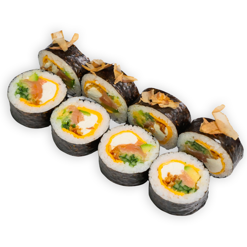Лосось копчений ,чир чеддер,авокадо крем сир,огірок,цибуля смажена,соус унагі,соус сирний,рис норі,стружка тунця.