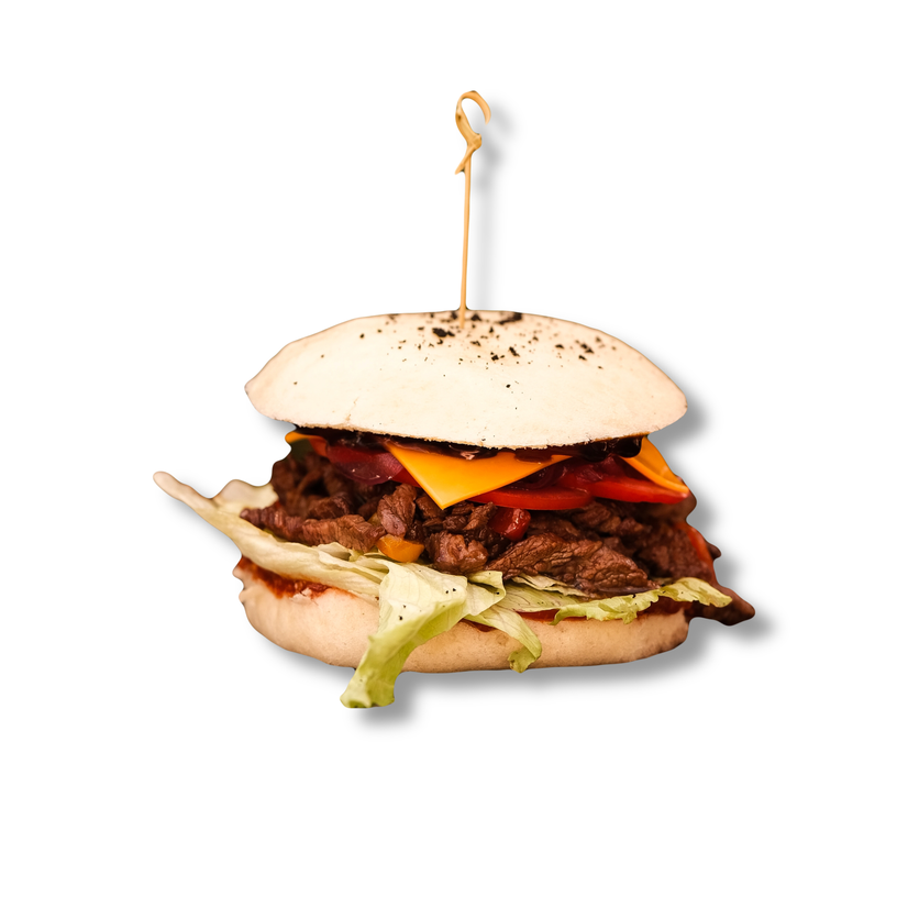 Бао хлібець, яловичина, сир чедер, соус BBQ, цибуля карамелізовна, соус унагі, соус устрічний, помідори, айсберг, перець болгарський, часник, корінь імбиря