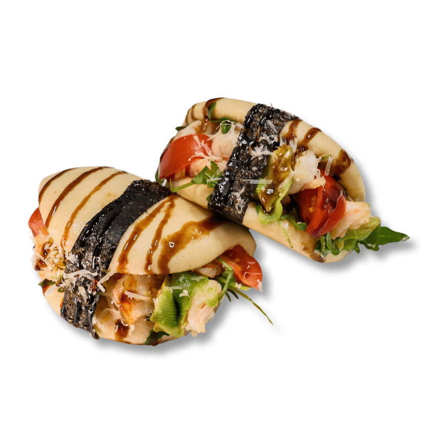 Креветки тигрові, парова булочка бао, рукола,соус цезар , крем сир, томати чері, пармезан