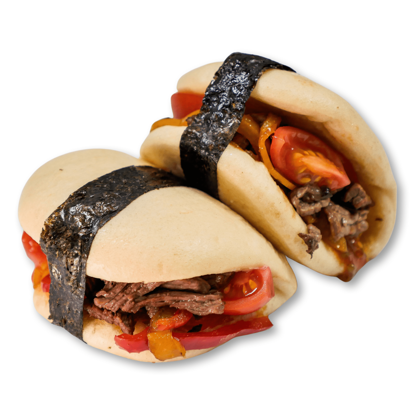 Яловичина , парова булочка бао,болгарський перець,часник,імбир корінь,соус BBQ,томати чері.