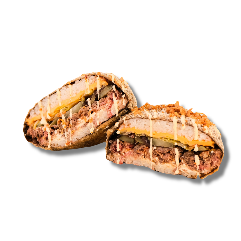 Яловичина, сир чеддер, огірки консервовані, авокадо, крем-сир, рис, сухарі панко, соус BBG, цибуля карамелізована, цибуля смажена, айсберг.