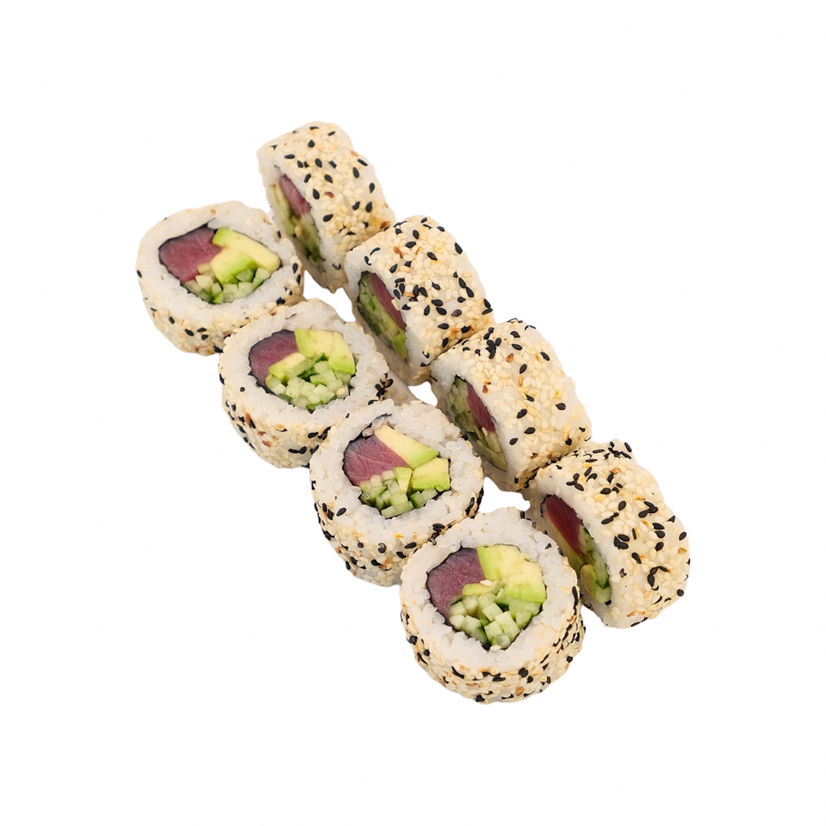 Тунець, огірок, авокадо, рис, кунжут, норі, соус спасі (гострий)
