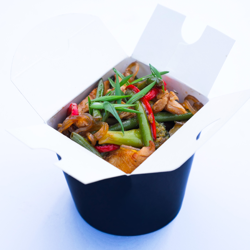 Локшина Хурасаме, куряче філе, болгарський перець,квасоля спаржева,капуста броколі, цибуля порей, соус устрічний,соус соєвий, часник,імбірь.
