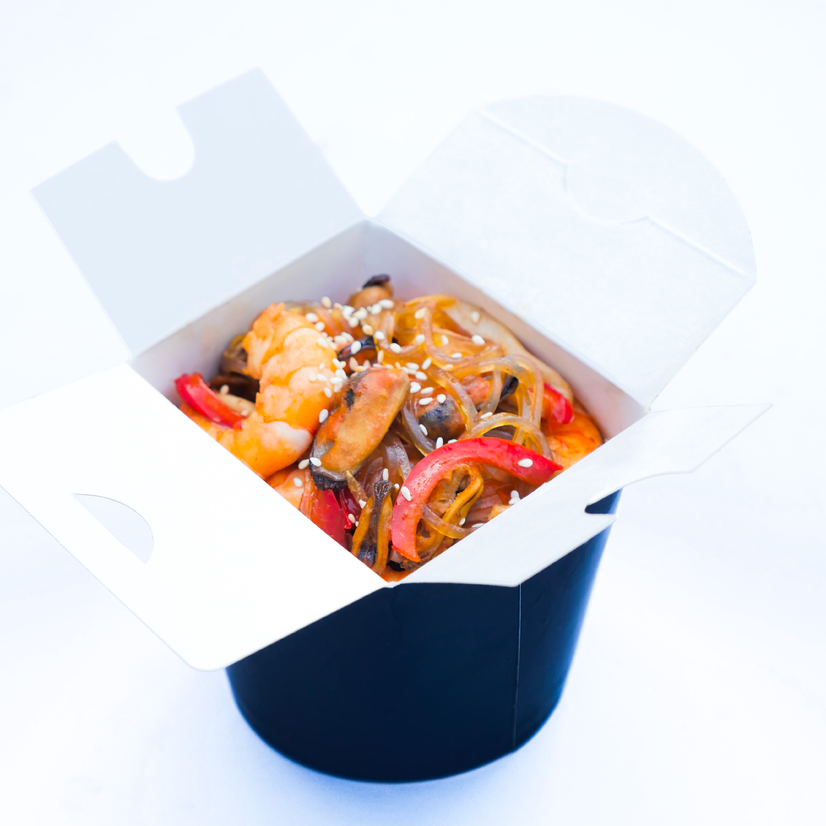 Локшина рисова, кальмари, мідії, креветки тигрові, соус устрічний, часник ,імбірь,болгарський перець,соус соєвий.