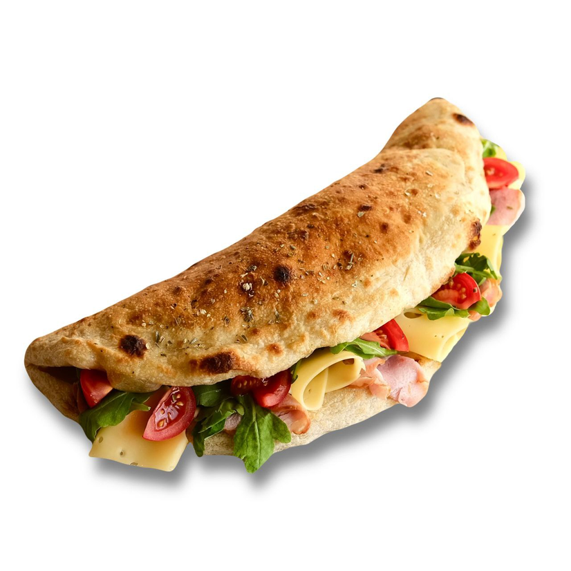 Балик свинний копчений,крем сир,соус BBQ,помідори чері,руккола,сир чедер,орегано.