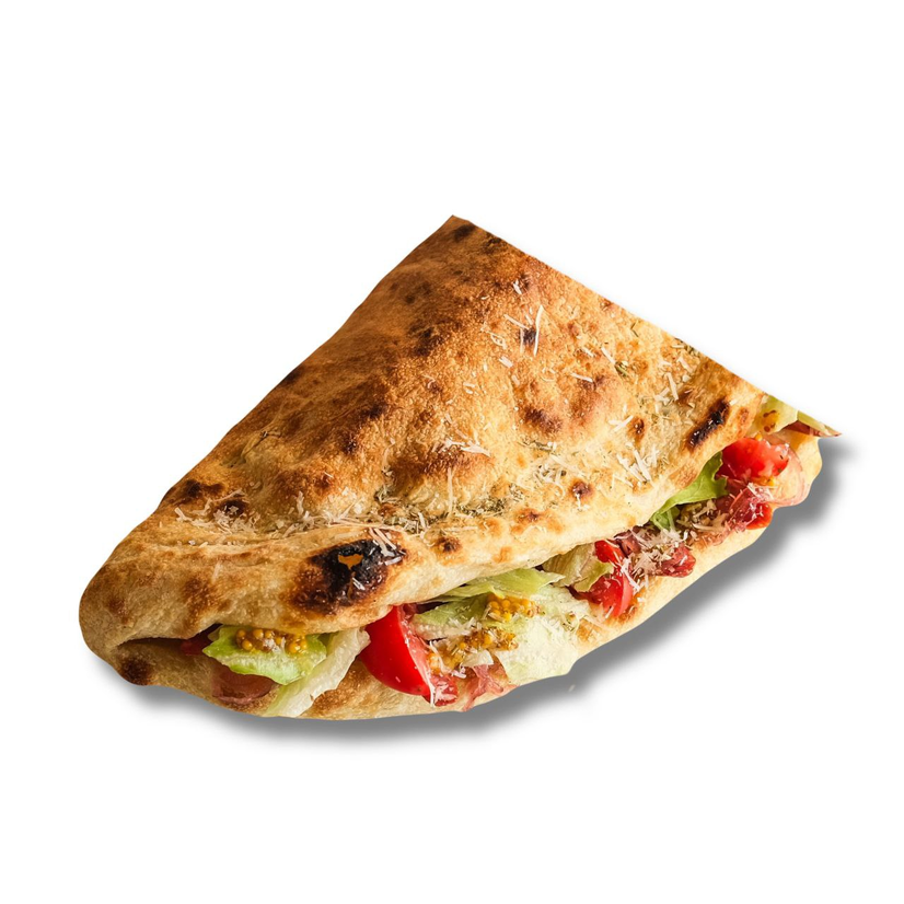 Мисливські ковбаски,крем сир,помідори черрі,цибуля синя,діжонська гірчиця,салат айсберг,сир пармезан,соус сметанний,ферментоване тісто.
