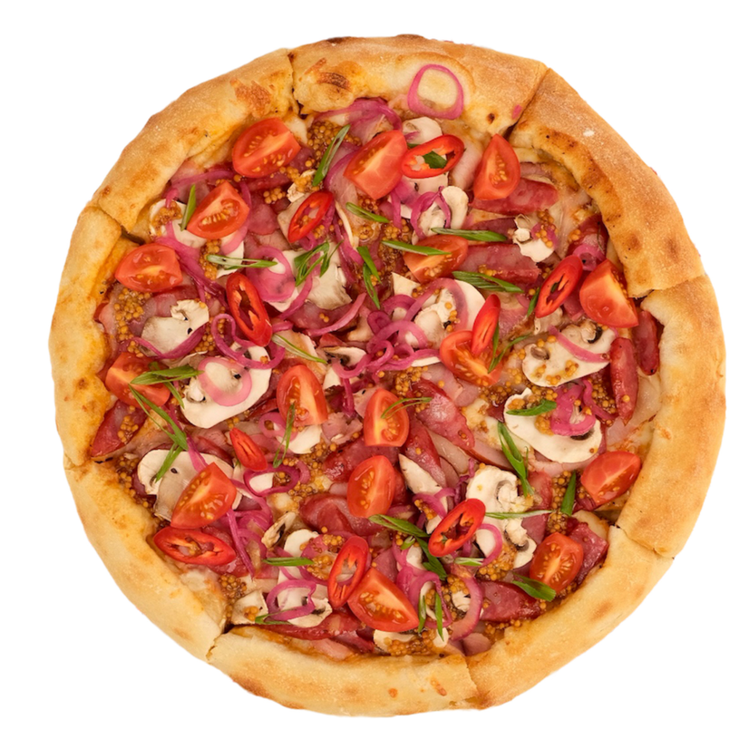 Ковбаски мисливські, бекон, гриби шампіньйони, сир моцарелла, помідори чері, соус маринара, цибуля зелена, цибуля синя, діжонська гірчиця, перець чилі