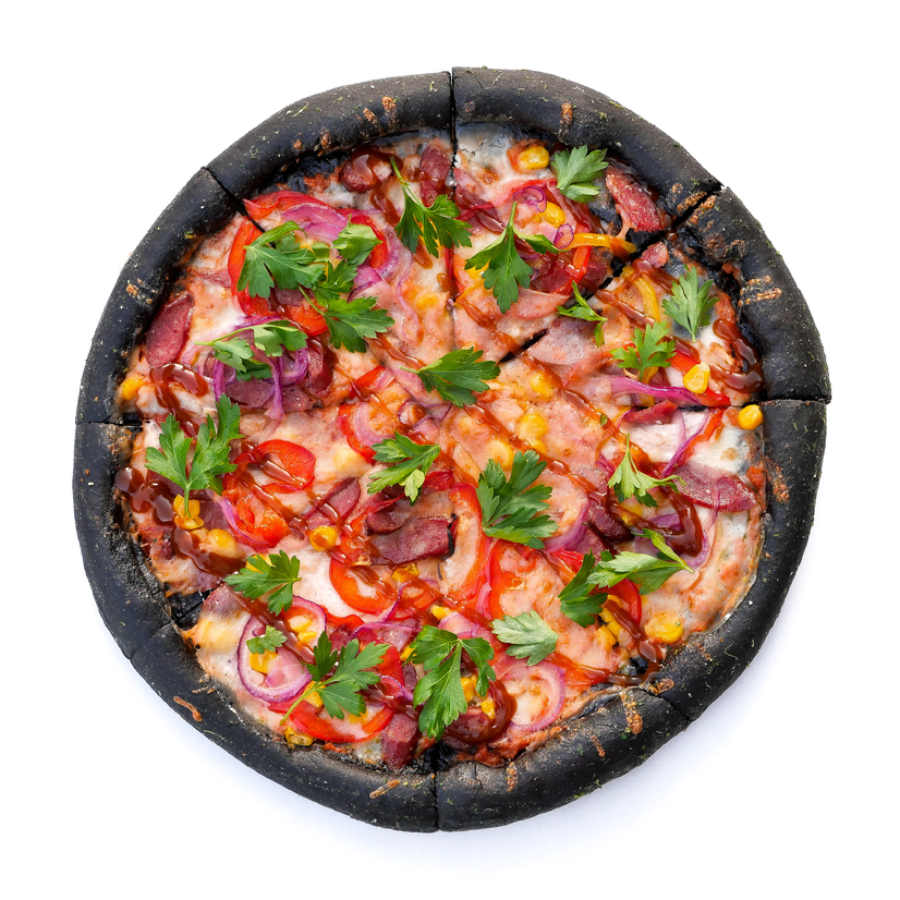 Ковбаски мисливськи, куряче філе копчене, сир моцарела,синя цибуля, болгарський перець,кукурудза, соус маринара,соус барбекю,чорнило каракатиці.