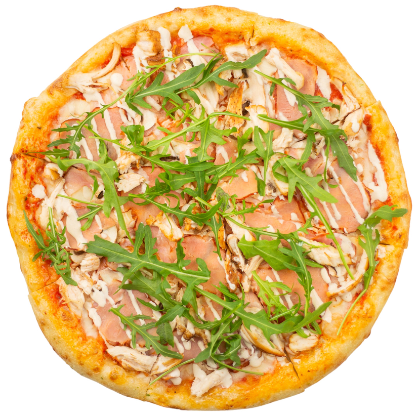 Куряче філе смажене, балик свинний, бекон, гриби шампіньйони, сир моцарелла, помідори, соус маринара, соус цезар, рукола, петрушка