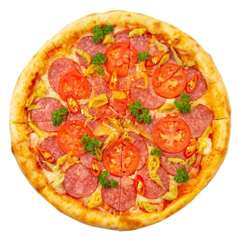 Салямі піканте, перець пепероні, перець чилі, помідори, сир моцарела, соус Маринара, петрушка, орегано