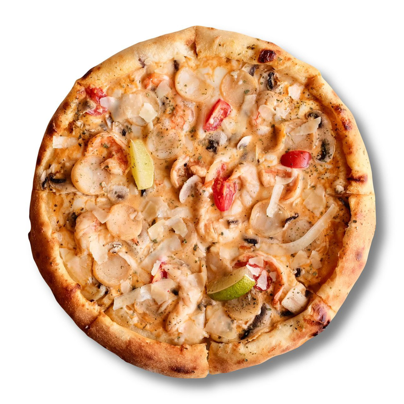 Креветки тигрові,медальйони морських гребінців,кокосове молоко,вершковий соус,лемонграс,томатна паста,кінза,лайм,гриби печериці,помідори черрі,пармезан.