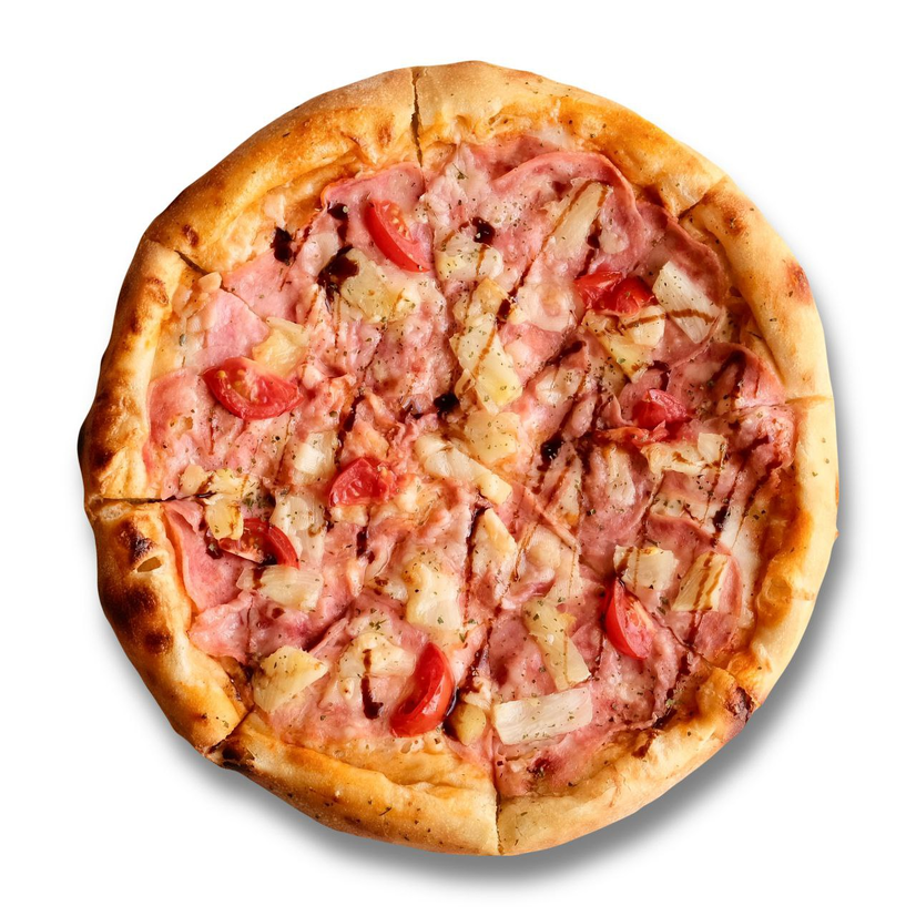 Балик свинний, сир моцарелла, соус цезар, маринара соус, пармезан, орегано сушене,ананаси,вершковий соус,томати черрі.