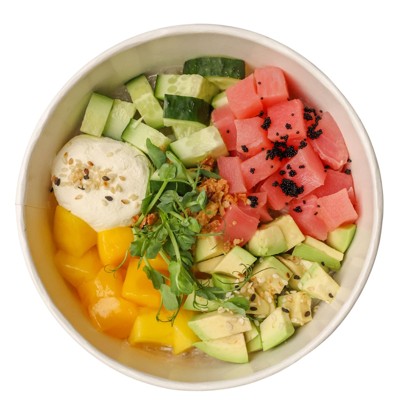 Тунець, авокадо, манго, крем-сир, огірок, ікра тобіко, соус манговий, соус кімчі,соєвий соус, смажена цибуля