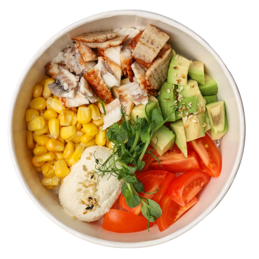 Вугор, авокадо, крем-сир, кукурудза, помідори чері, соус унагі,соєвий соус, рис, кунжут