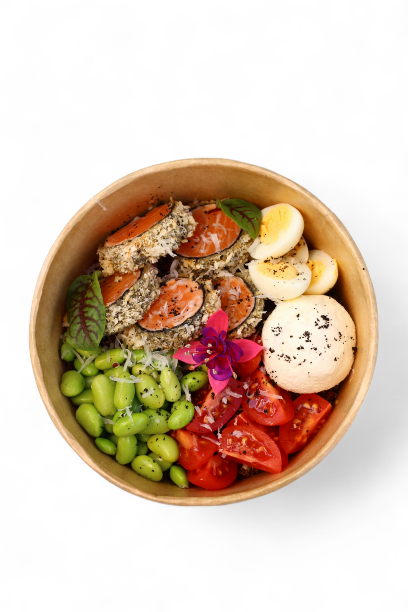 Лосось, кіноа, боби адамаме, яйця перепелині, помідори чері, крем сир, пармезан, соус унагі, водорослі норі.