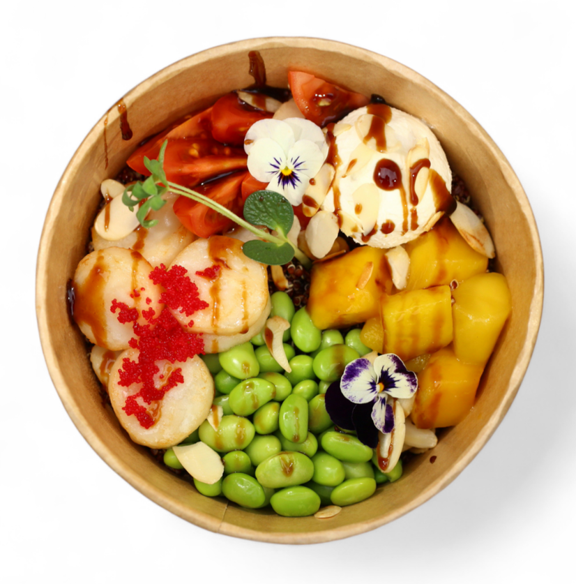 Морський гребінець, кіноа, крем-сир, помідори чері, огірок, соус аліолі з манго,ікра тобіко, боби адамаме, соус унагі, мигдалеві пластівці.