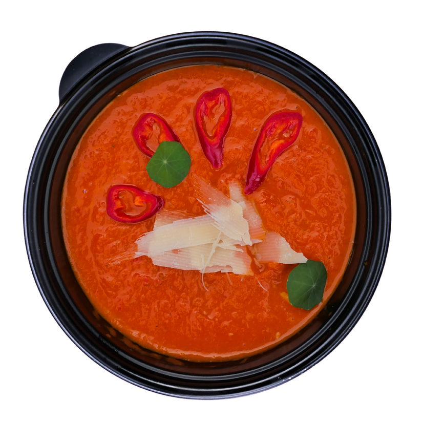 Томати, перець болгарський,томати чері, цибуля ріпчаста, перець чилі, мікрогрін, пармезан, сіль, багет