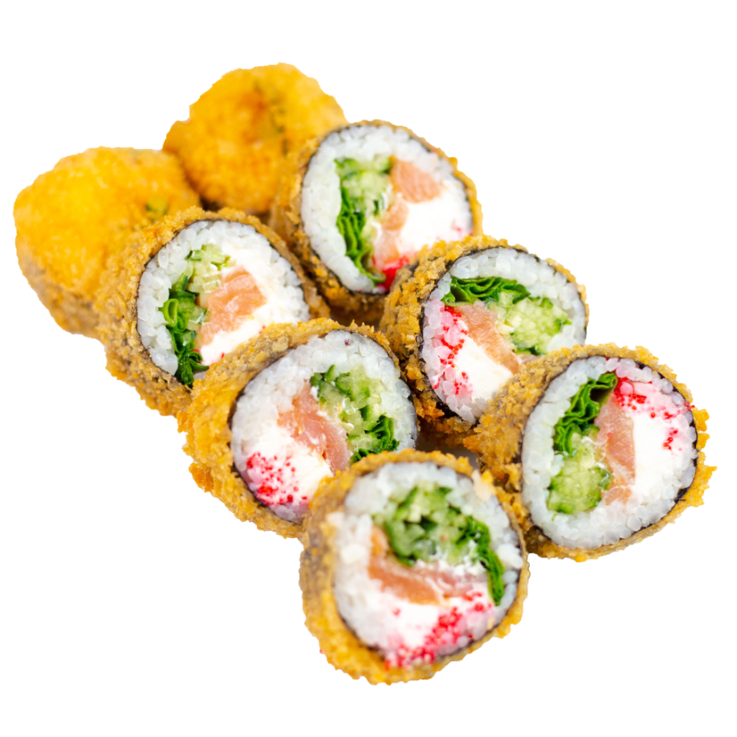 Копчений лосось, кляр, крем-сир, огірок, ікра, соус спайсі, цибуля зелена