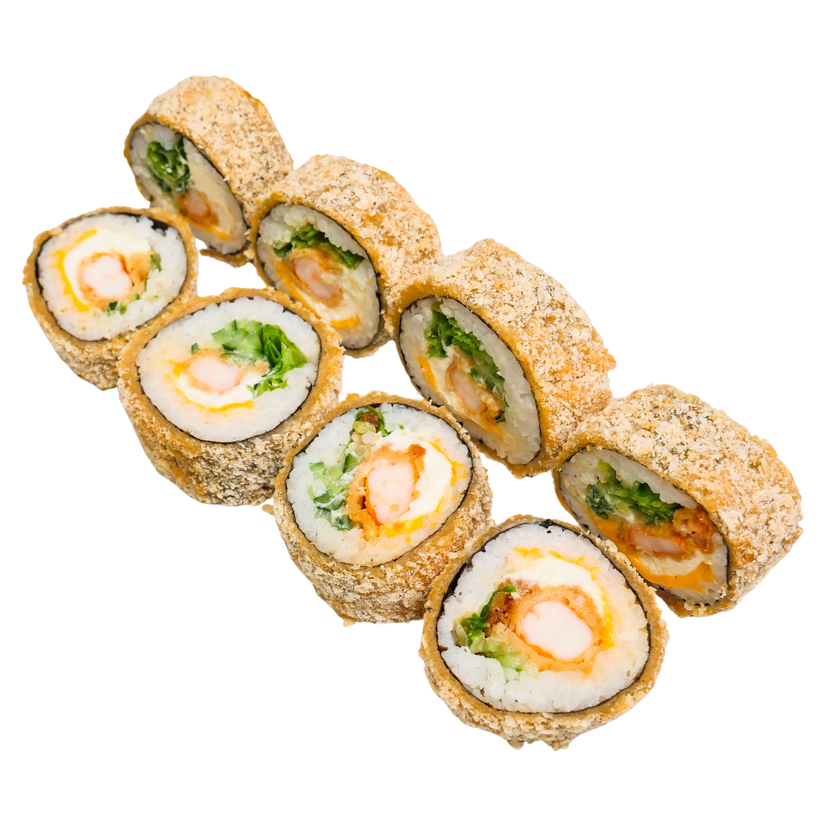 Креветка тигрова , огірок, соус солодкий чілі, крем-сир, сухарі панко, норі, рис,салат айсберг,соус сирний.