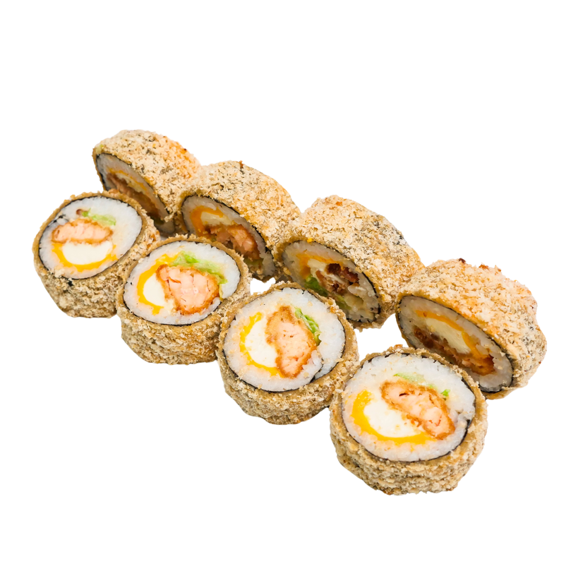 Лосось, соус унагі, крем-сир, сухарі панко, норі, рис,салат айсберг,соус сметанний,сир чедер.