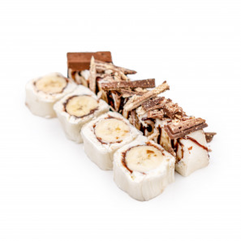 Шоколад Kitkat, рисовий папір, банан, горіхова паста, солодкий сир, шоколадний топінг