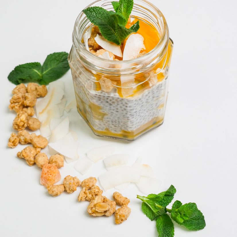 Маракуя пюре,персик консервований,насіння чіа,йогурт білий,згущене молоко,гранола,кокосові чіпси