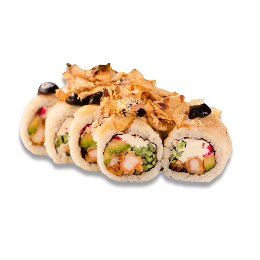 Гребінець,креветка тигрова ,авокадо,огірок, стружка тунця,вишня амарена, крем-сир, ікра тобіко червона,сухарі панко,рис, норі,лист бамбука,соус соєвий унагі, мікрогрін.