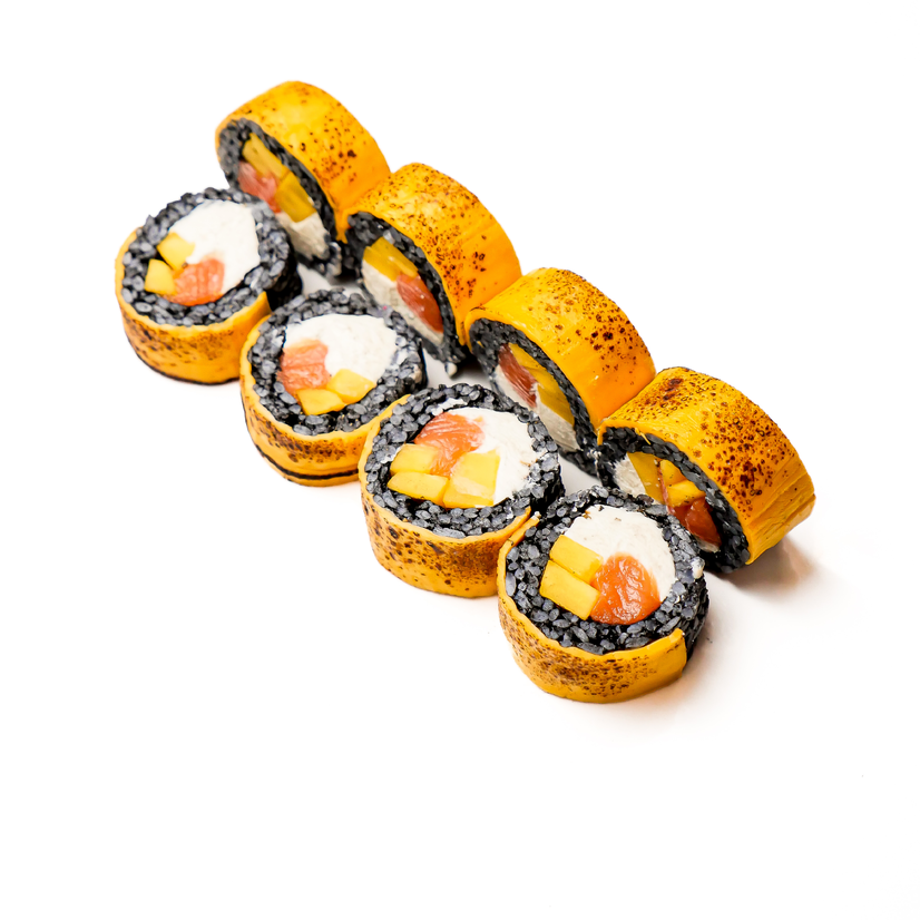 Лосось свіжий,рис, крем-сир, манго, чорнила каракатиці, сир чедер, соус унагі