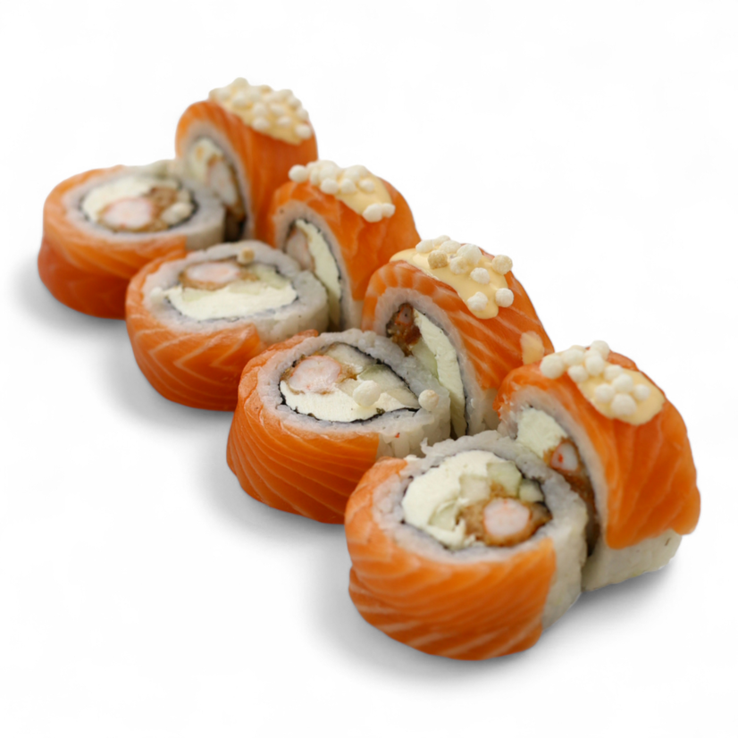 Лосось, крем-сир, креветка тигрова,груша,соус сирний, норі, рис.