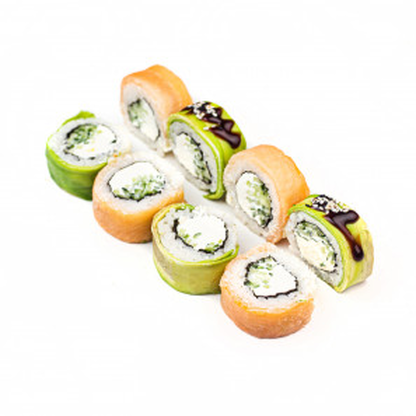 Копчений лосось, крем-сир, огірок, авокадо, унагі, кунжут, норі, рис