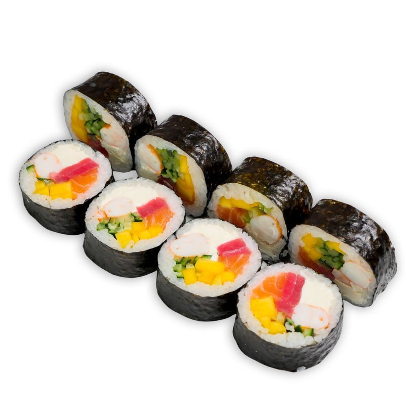 Креветки тигрові, тунець,лосось свіжий, крем-сир, манго, норі, рис,огірок,соус унагі.