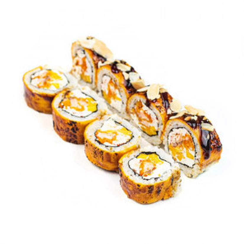 Смажений лосось, сухарі панко, крем-сир, сніжний краб, чеддер, манго, соус унагі, пластівці мигдалю, норі, рис
