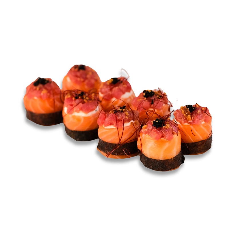 Тунець,лосось свіжий, ікра тобіко, соус спайсі,соус устрічний,пармезан, крем-сир, норі, рис, цибуля смажена.
