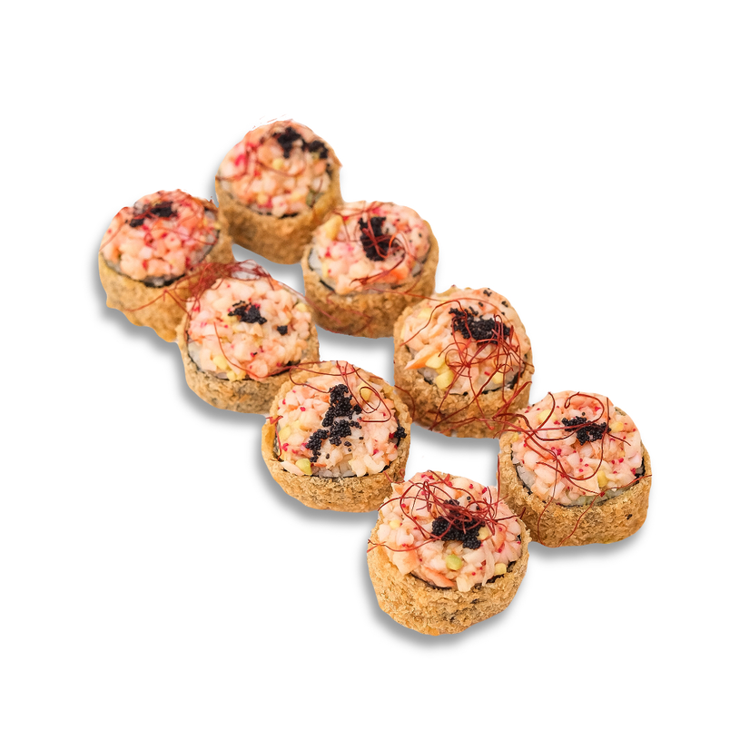 Креветки тигрові, крем-сир, сухарі Панко, норі, рис, авокадо, ікра тобіко черно, пармезан, мікрогрін, соус солодкий чілі.