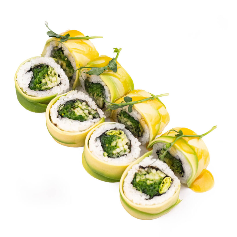 Авокадо, огірок, водорості чука вакаме, салат Айсберг, горіховий соус, манговий соус, мікроґрін, рис