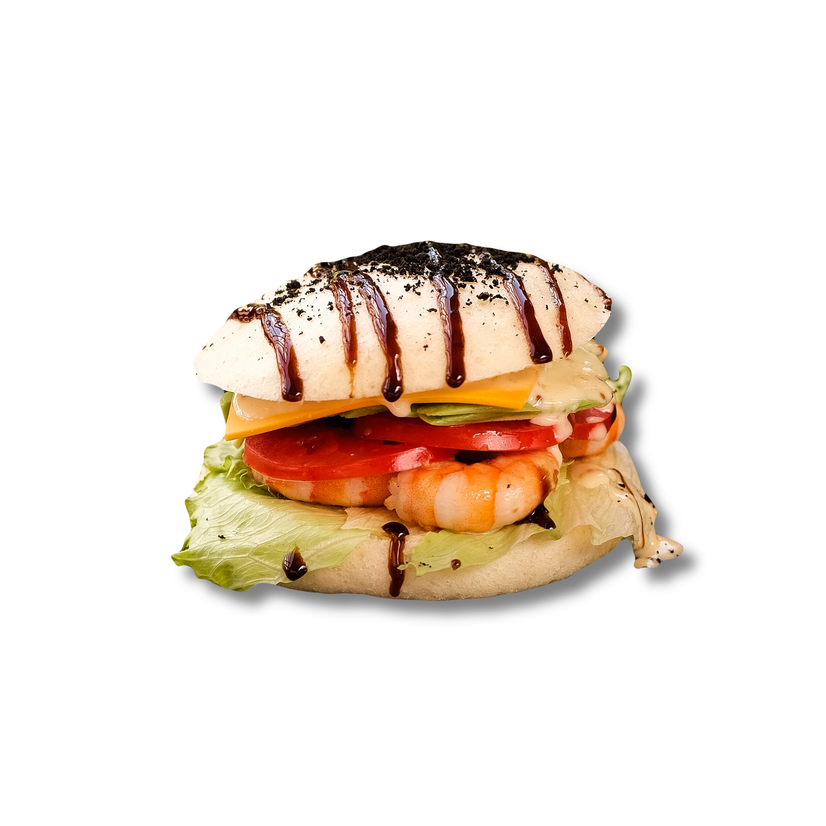 Бао хлібець, тигрова креветка, сир чеддер, соус вершковий, соус соєвий, авокадо, помідори, айсберг