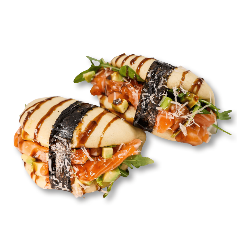 Лосось, парова булочка бао, лист салата,заправка піканта, крем сир,авокадо, томати чері, пармезан