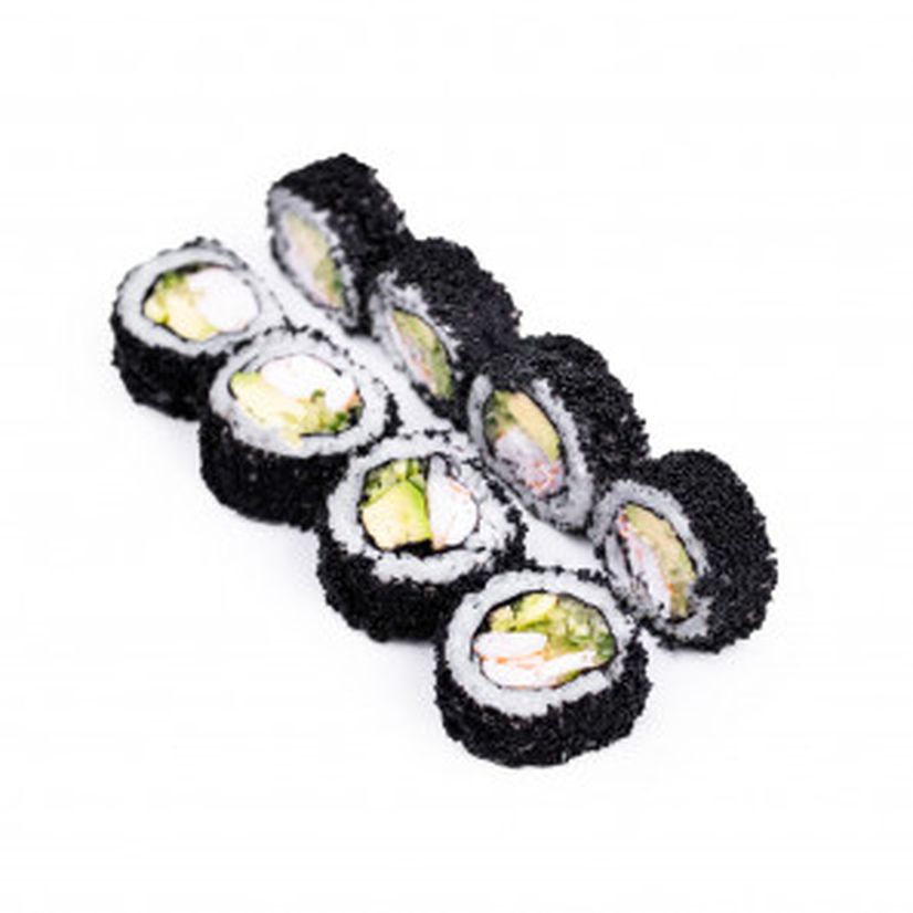 Тигрові креветки, огірок, авокадо, чорна ікра тобіко, норі, рис