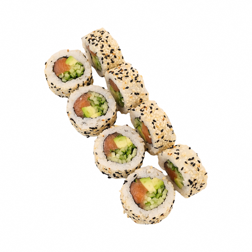 Лосось, огірок, авокадо, майонез, кунжут білий, рис, норі, рис