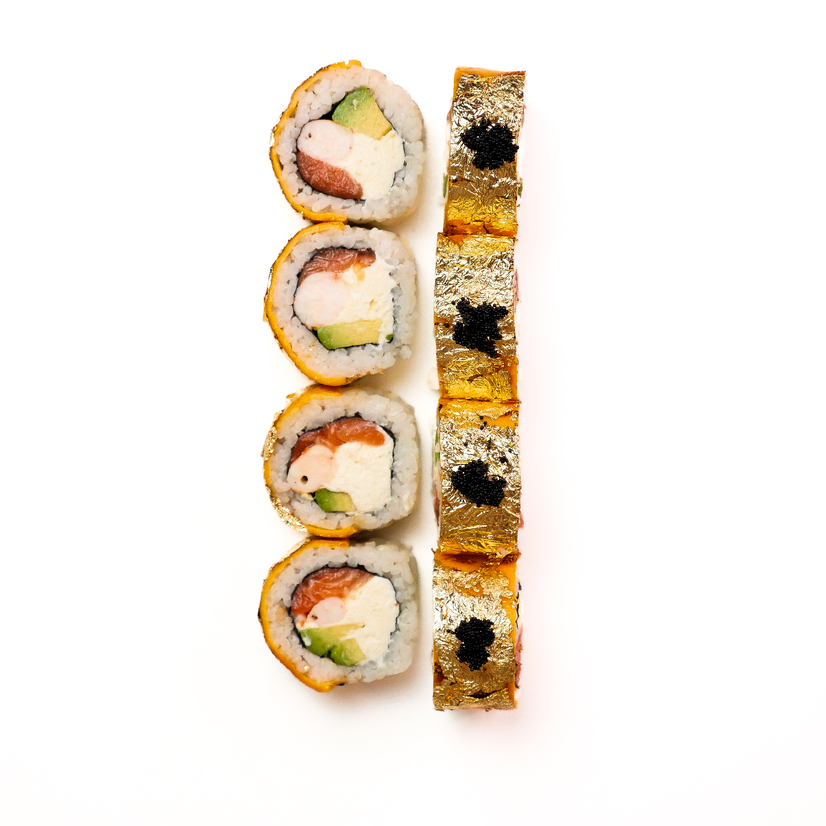 Лосось свіжий , креветки тигрові, рис, крем-сир, авокадо, сир чедер, кра тобіко чорна, сусальне золото