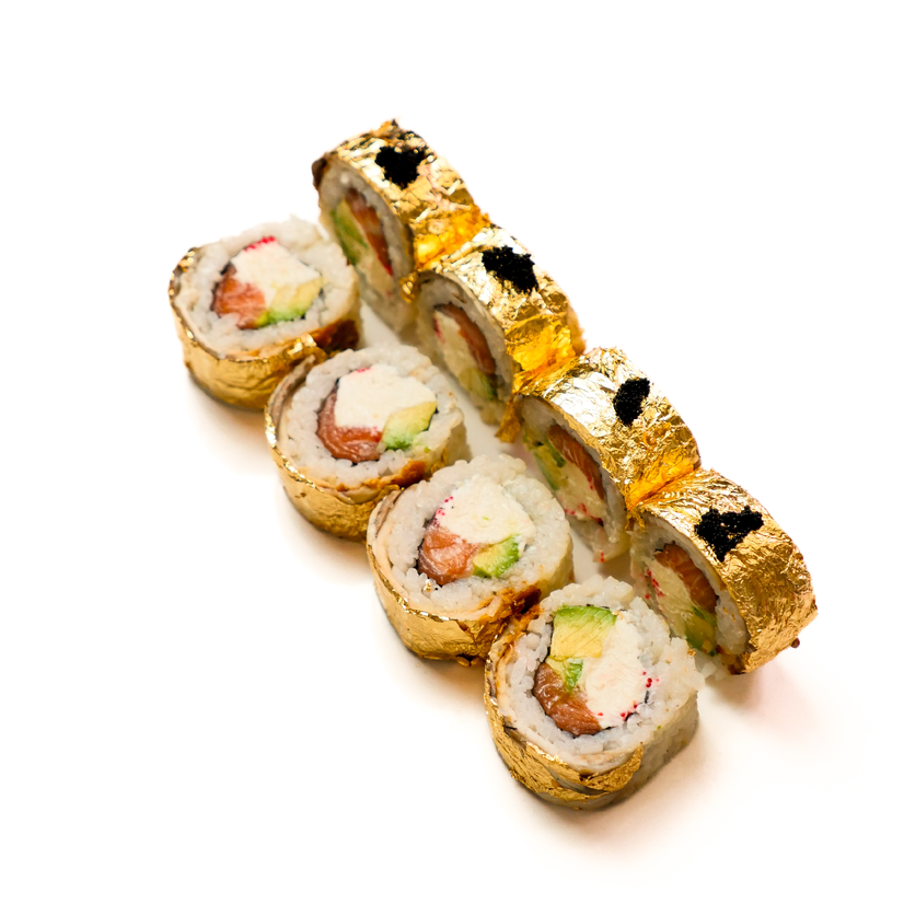Лосось свіжий, вугор, крем-сир, норі, рис, авокадо, ікоа тобіко чорна, ікра тобіко червона, золото сусальне