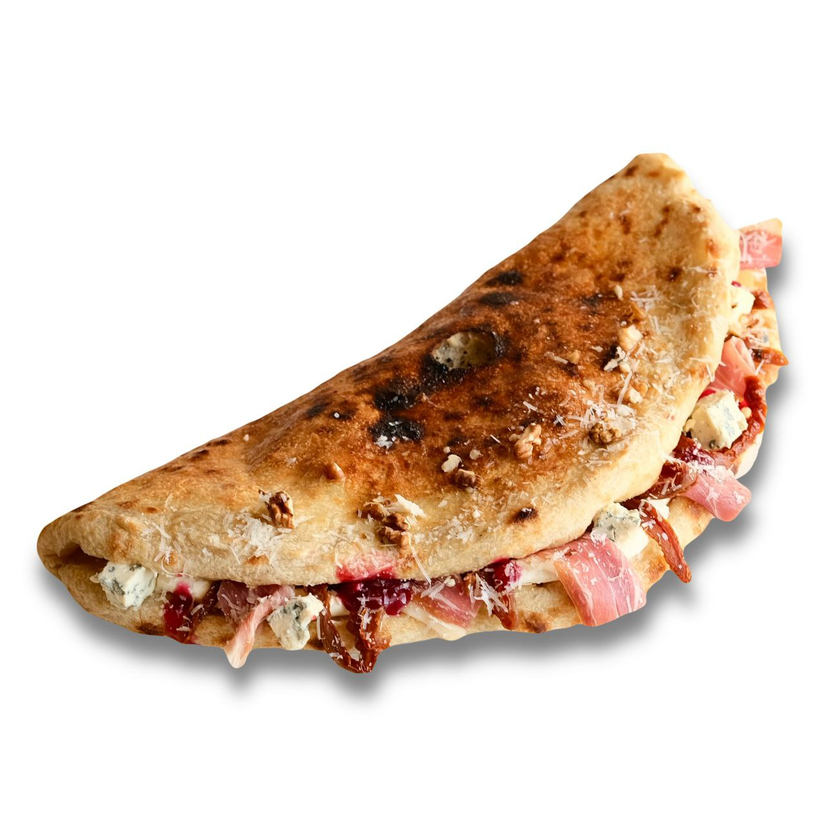Прошуто, сир пармезан,сир дорблю,крем сир, горіхи грецькі,томати в'ялені,олія оливкова,соус малиновий.