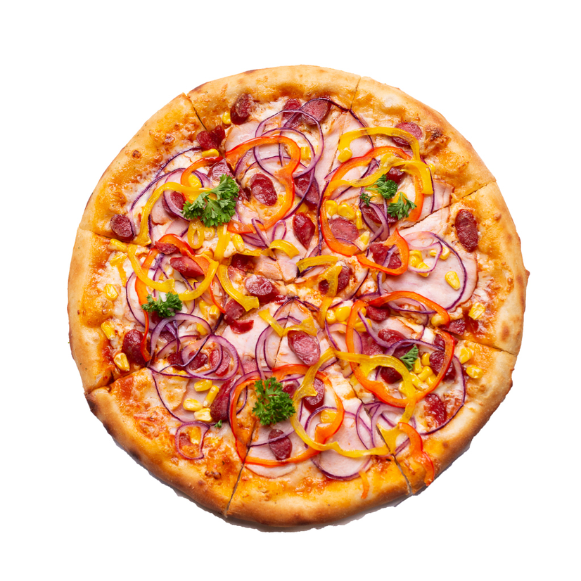 Ковбаски мисливськи, куряче філе копчене, сир моцарела,синя цибуля, болгарський перець,кукурудза, соус маринара,соус барбекю