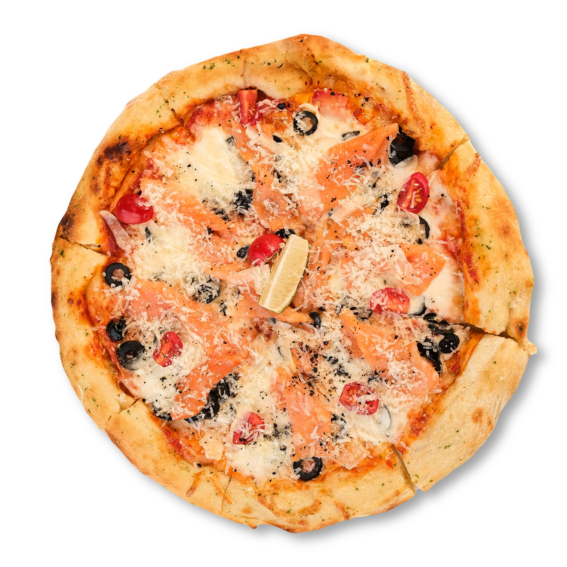 Лосось свіжий, помідори чері, сир моцарелла, соус цезар, маринара, соус унагі, маслини, пармезан, лайм, орегано сушене