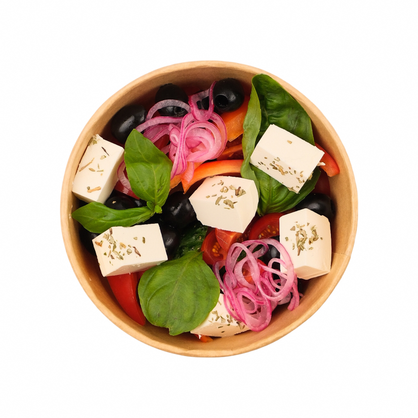 Черрі, болгарський перець, огірки, фета, цибуля синя, базилік, маслини, зелень мікрогрін, оливкова олія