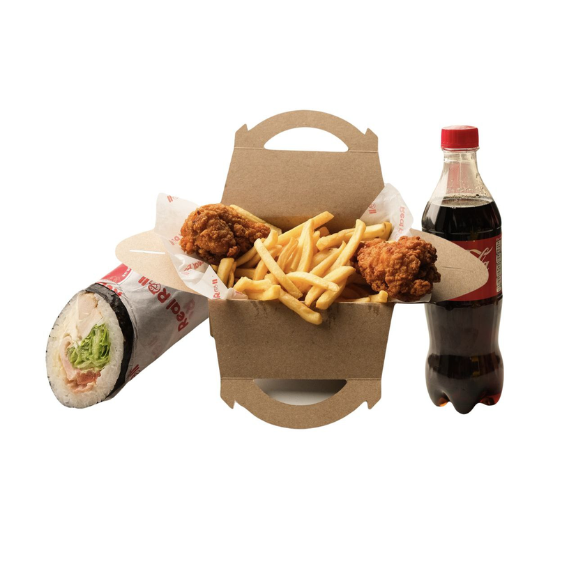 Крило плечова частина,кукурудзяна паніровка,сіль,спеції,картопля фрі,темакі з куркою,кола 0,5л.