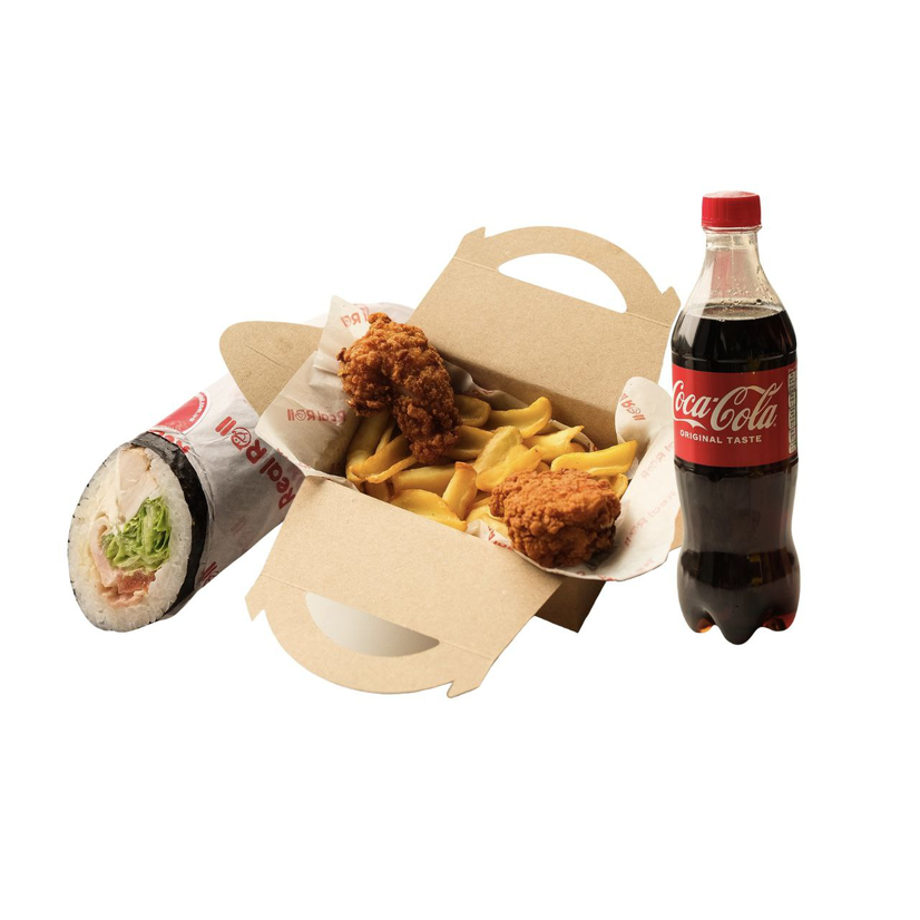 Крило плечова частина,кукурудзяна паніровка,сіль,спеції,картопляні діпи фрі,темакі з куркою,кола 0,5л.