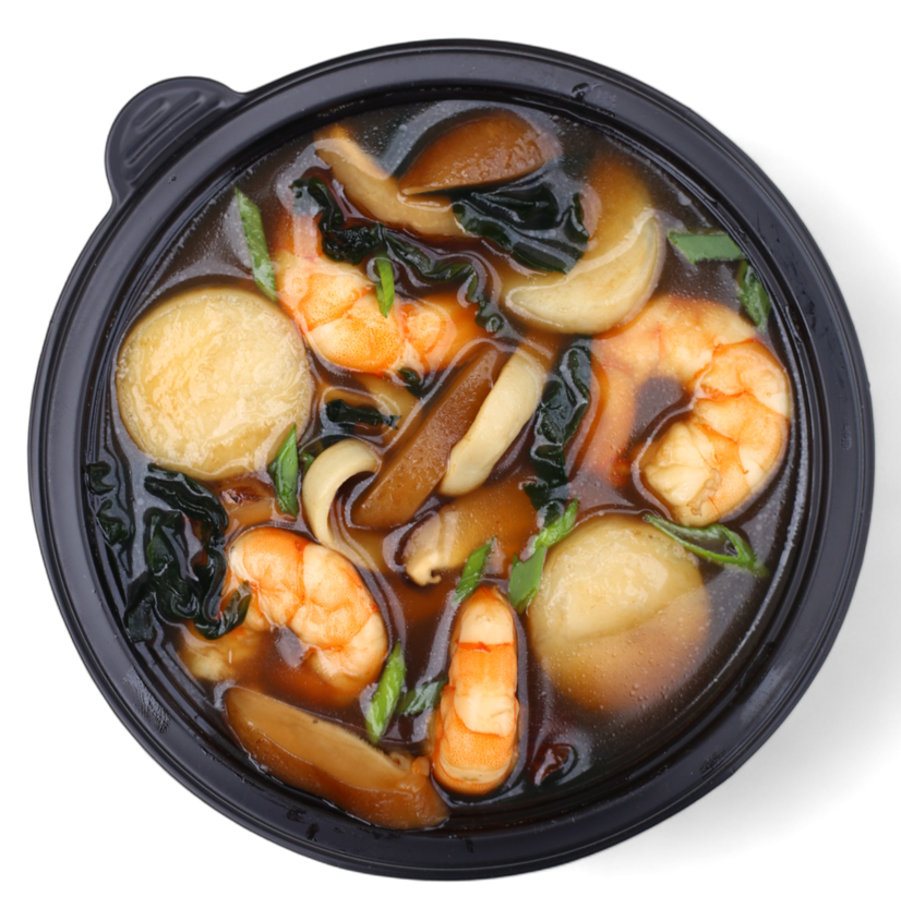 Креветки тигрові , гребінець морський , кальмар, водорослі вакаме, гриби шиєтаке, олія кунжутна, соус кімчі. багет.